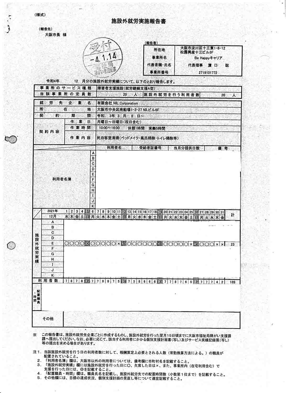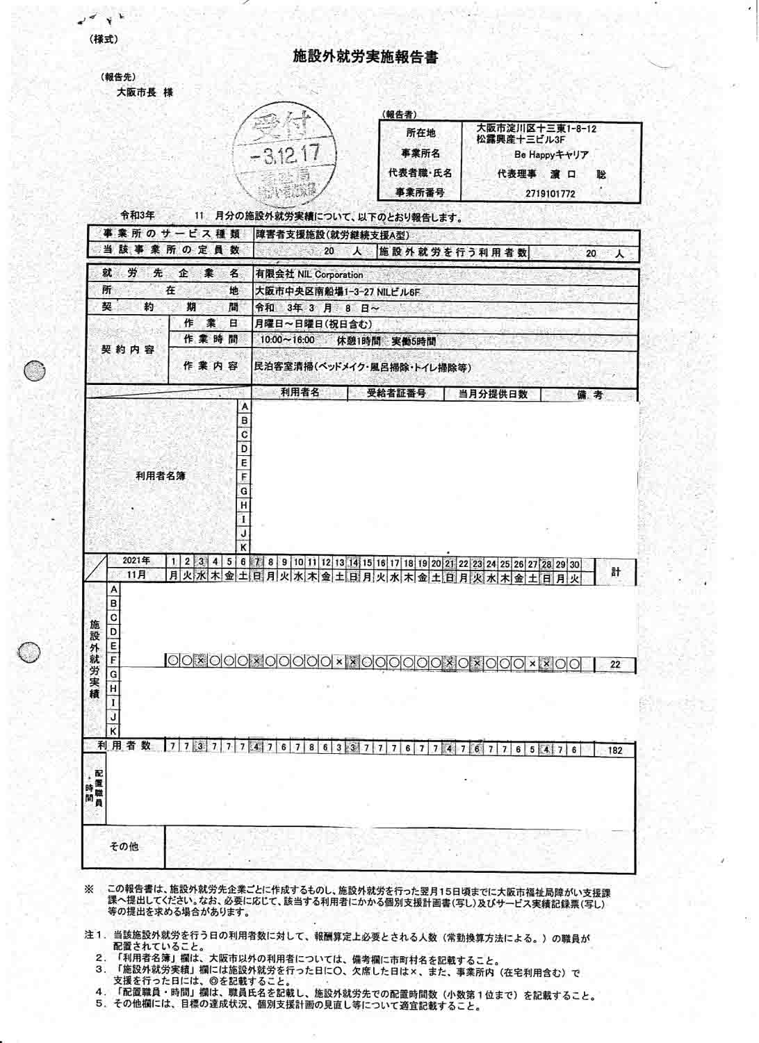 有限会社NIL Corporation(本社:大阪市中央区南船場1-3-27 NILビル6F)と株式会社セイビ(本社:東京都中央区日本橋人形町3-3-3 セイビ人形町ビル)を就労先として、民泊・ホテルの清掃業務に行ったことになっていますが、実際には本人は一度も行ったことがありません。