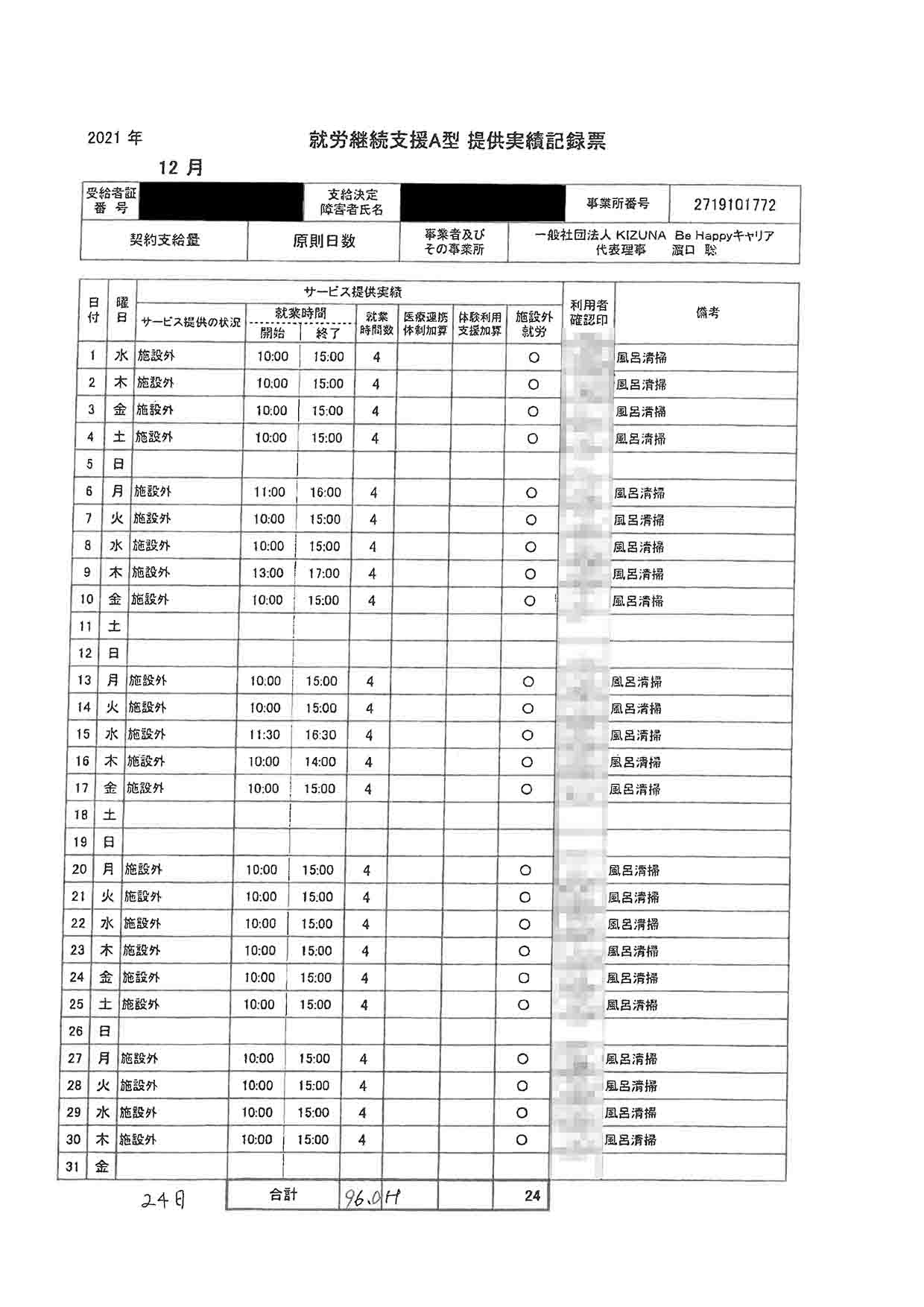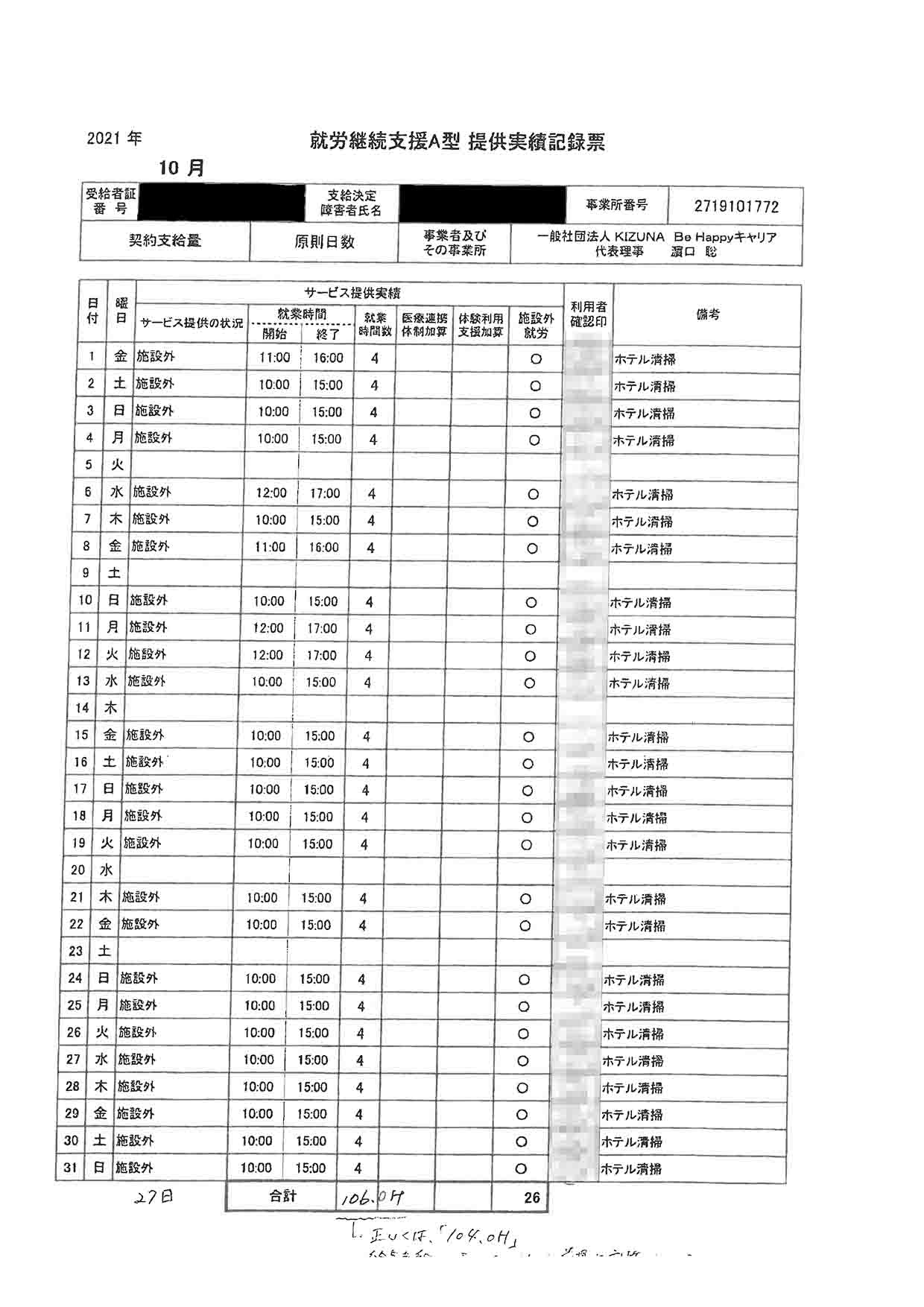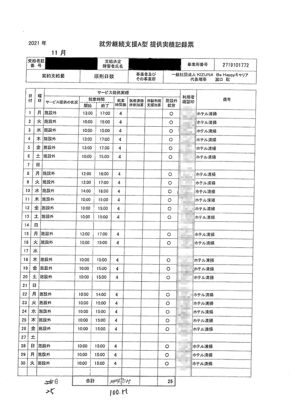 法人側が送付してきた押印済みの実績記録票には、ほぼ毎日ホテルの清掃作業に行っていたと記載されています。