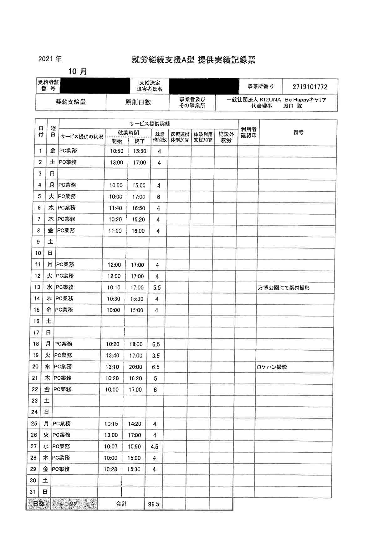 2021年10月は、本人が付けていたメモによると、22日間しか勤務していません。